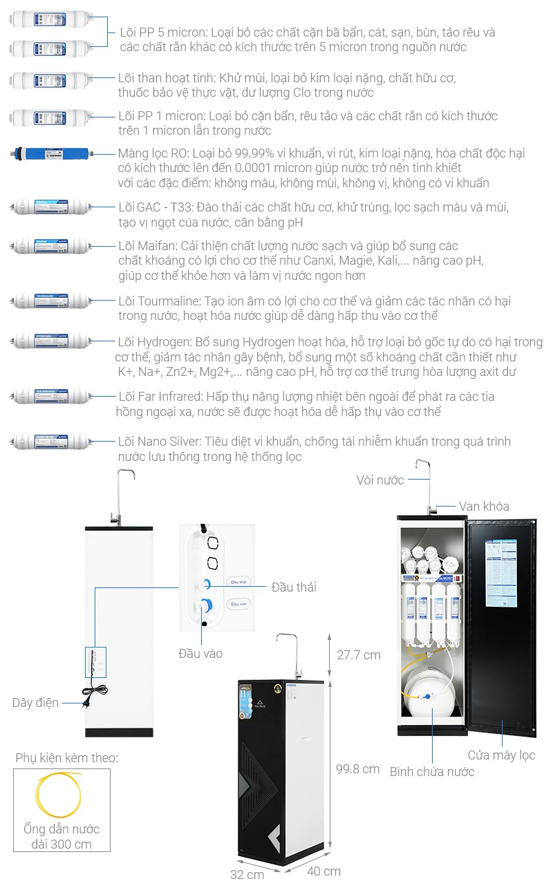 | Lõi chức năng | Lõi 6: GAC - T33 (Sx Việt Nam) Lõi 7: Maifan (Sx Việt Nam) Lõi 8: Tourmaline (Sx Việt Nam) Lõi 9: Hydrogen (Sx Việt Nam) Lõi 10: Hồng ngoại xa (Sx Việt Nam) Lõi 11: Nano Silver (Sx Việt Nam) |