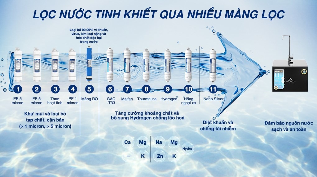 - Được trang bị 11 cấp lọc bao gồm: 4 lõi lọc thô, 1 màng lọc RO, 6 lõi lọc chức năng