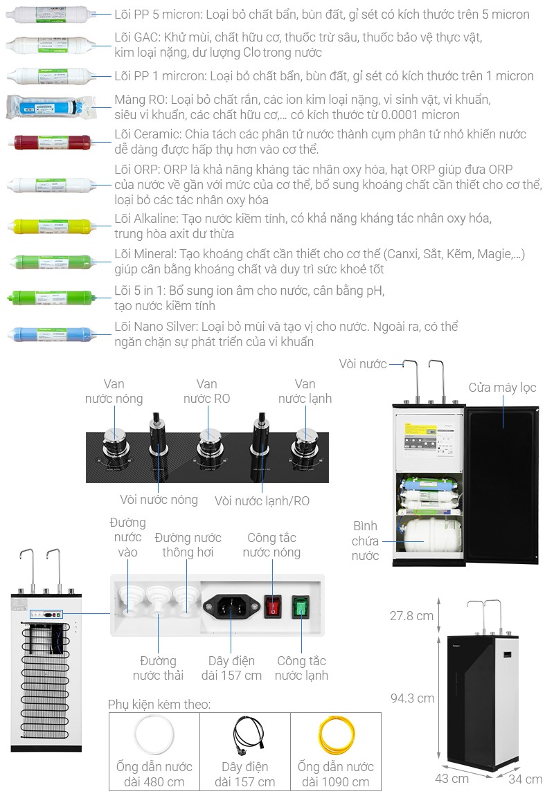 | Lõi chức năng | Lõi 5: Ceramic (Sx Việt Nam) Lõi 6: ORP (Sx Việt Nam) Lõi 7: Alkaline (Sx Việt Nam) Lõi 8: Mineral (Sx Việt Nam) Lõi 9: 5 in 1 (Sx Việt Nam) Lõi 10: Nano Silver (Sx Việt Nam) |