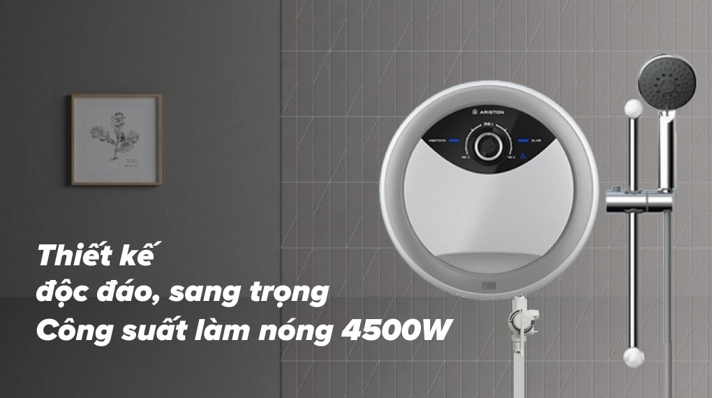 Máy nước nóng Ariston RMC45PE-VN 4500W có kiểu dáng tròn vô cùng độc đáo sẽ làm hài lòng bất kì vị gia chủ khó tính nào.