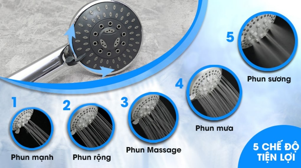 Vòi sen gồm 5 chế độ khác nhau: Phun mạnh, phun rộng, phun massage, phun mưa, phun sương. Cho phép bạn thoải mái lựa chọn kiểu phun lý tưởng, phù hợp với nhu cầu sử dụng.
