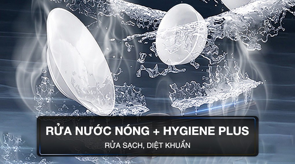- Công nghệ rửa diệt khuẩn Hygiene Plus có khả năng rửa sạch vết bẩn, mảng bám, dầu mỡ hiệu quả nhờ nhiệt độ xả cuối cùng lên đến 70°C và kéo dài trong 10 phút, đặc biệt phù hợp với những gia đình có trẻ nhỏ.
