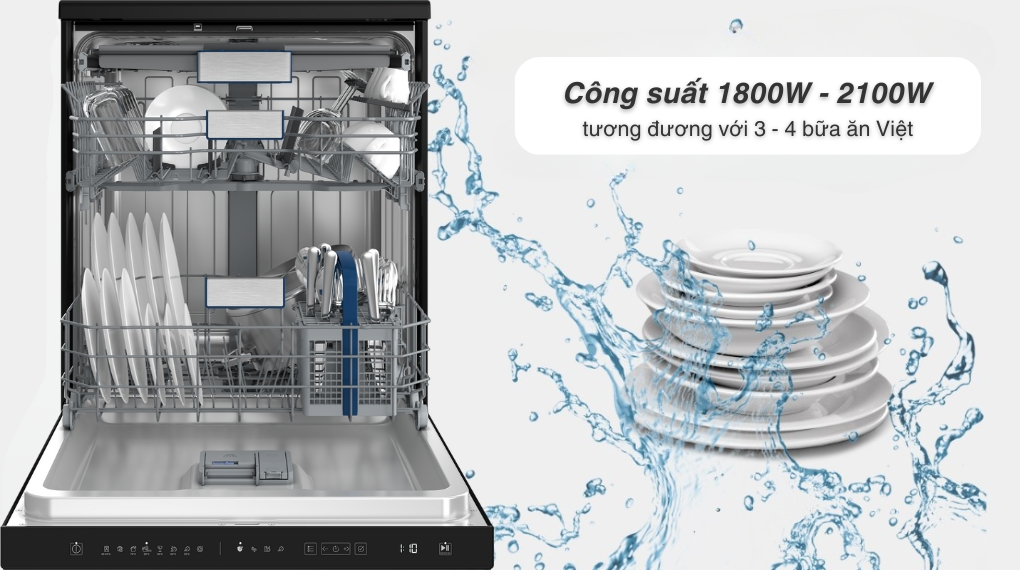 - Máy rửa Bát với công suất hoạt động từ 1800W - 2100W, cho phép gia đình bạn rửa được số lượng chén bát dùng cho 3 - 4 bữa ăn Việt (tương đương khoảng 15 bộ châu Âu).