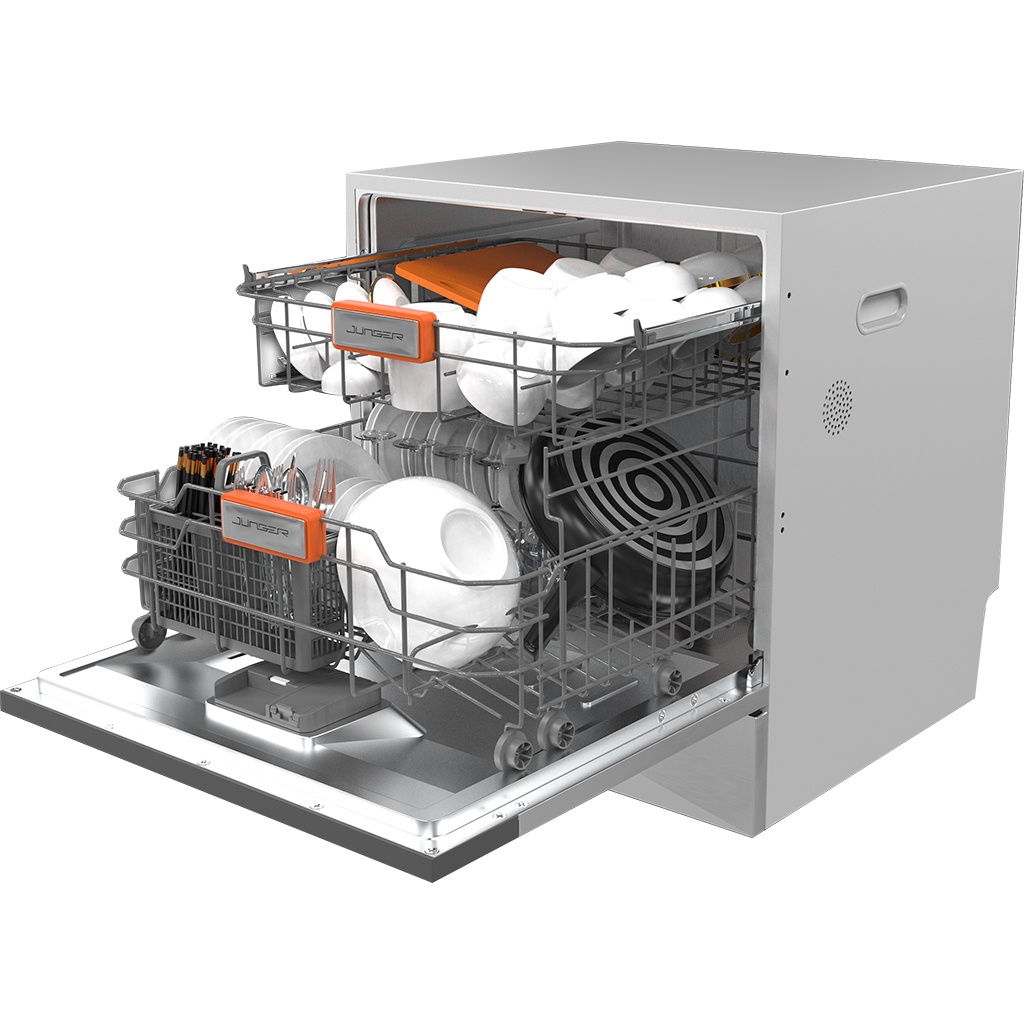 - Máy rửa bát độc lập Junger Leopard DWJ-100 trang bị 2 khay trên và khay dưới cùng 1 giỏ đựng dao thìa đũa giúp sắp xếp bát đĩa dễ dàng, tối ưu hiệu quả làm sạch.