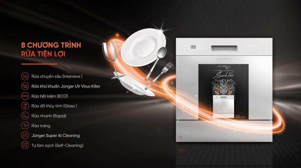- - Máy rửa bát độc lập Junger Leopard DWJ-100 với công nghệ rửa khử khuẩn bằng nước nóng 75°C kết hợp tia UV – Junger UV Virus Killer Tech loại bỏ mảng bám, dầu mỡ và diệt khuẩn. Tia UV hoạt động sau khi sấy, ngăn ngừa nấm mốc và mùi hôi, bảo vệ sức khỏe người dùng.