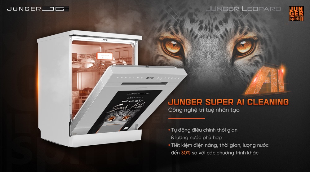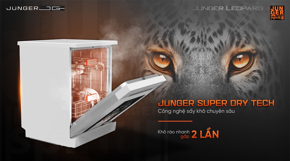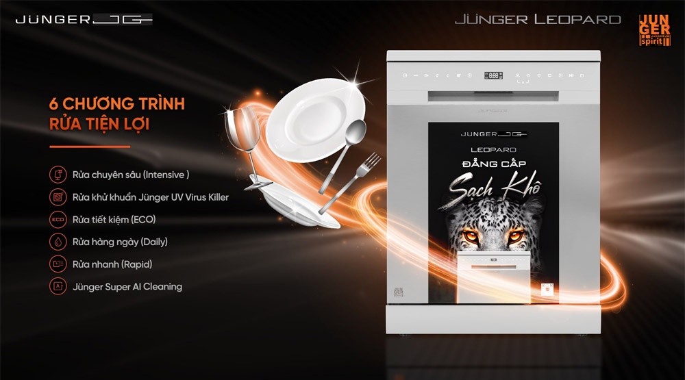 - - Máy rửa bát độc lập Junger Leopard DWJ-140 với công nghệ rửa khử khuẩn bằng nước nóng 75°C kết hợp tia UV – Junger UV Virus Killer Tech loại bỏ mảng bám, dầu mỡ và diệt khuẩn. Tia UV hoạt động sau khi sấy, ngăn ngừa nấm mốc và mùi hôi, bảo vệ sức khỏe người dùng.