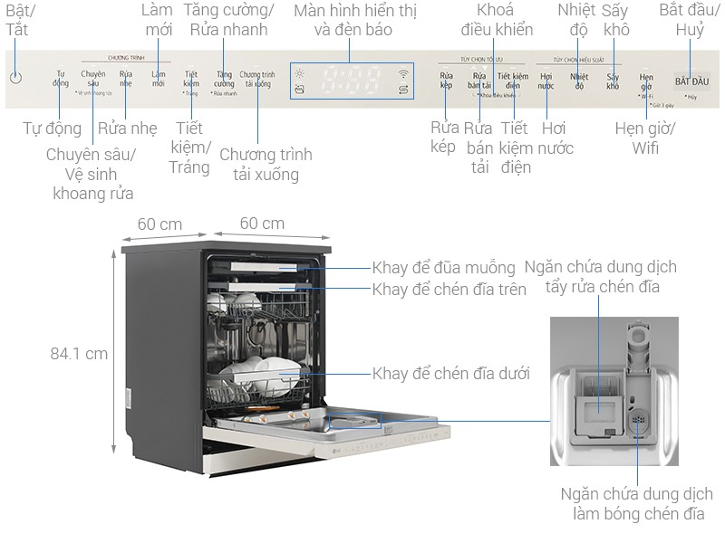 | Chương trình rửa | Rửa nhanh Rửa tiêu chuẩn (tiết kiệm) Rửa chuyên sâu Rửa nhẹ Rửa tự động Rửa tráng Làm mới Chương trình tải xuống Vệ sinh khoang rửa Rửa tăng cường |