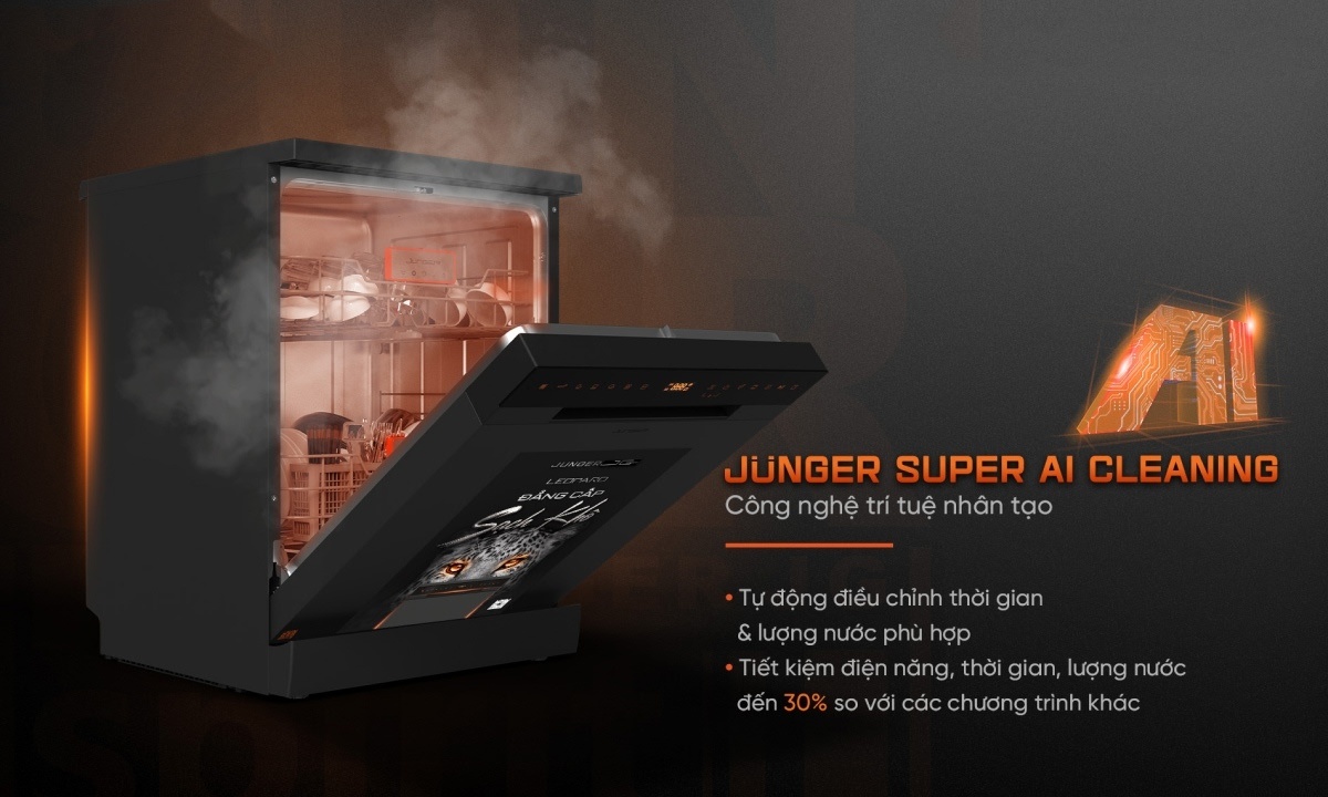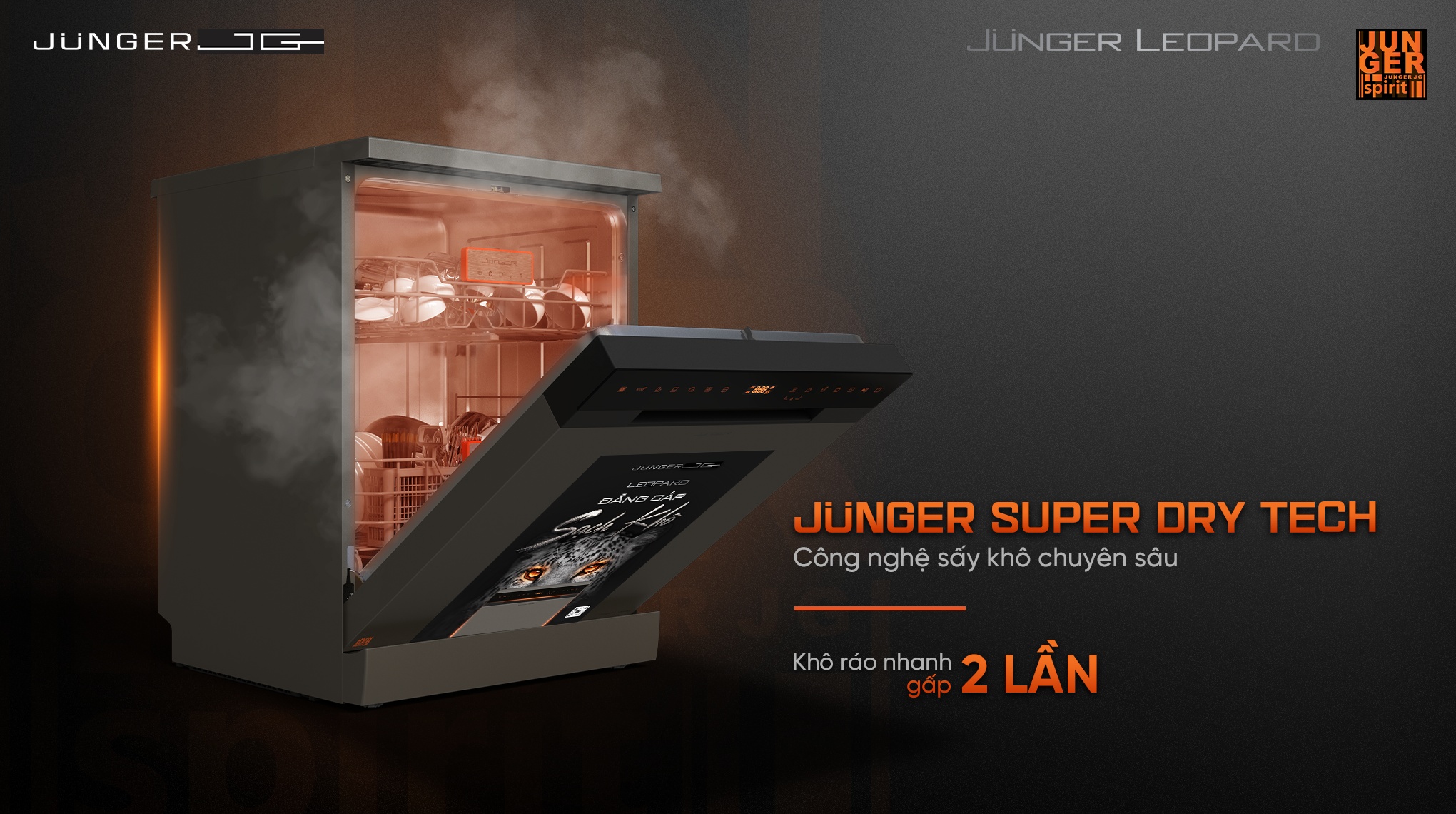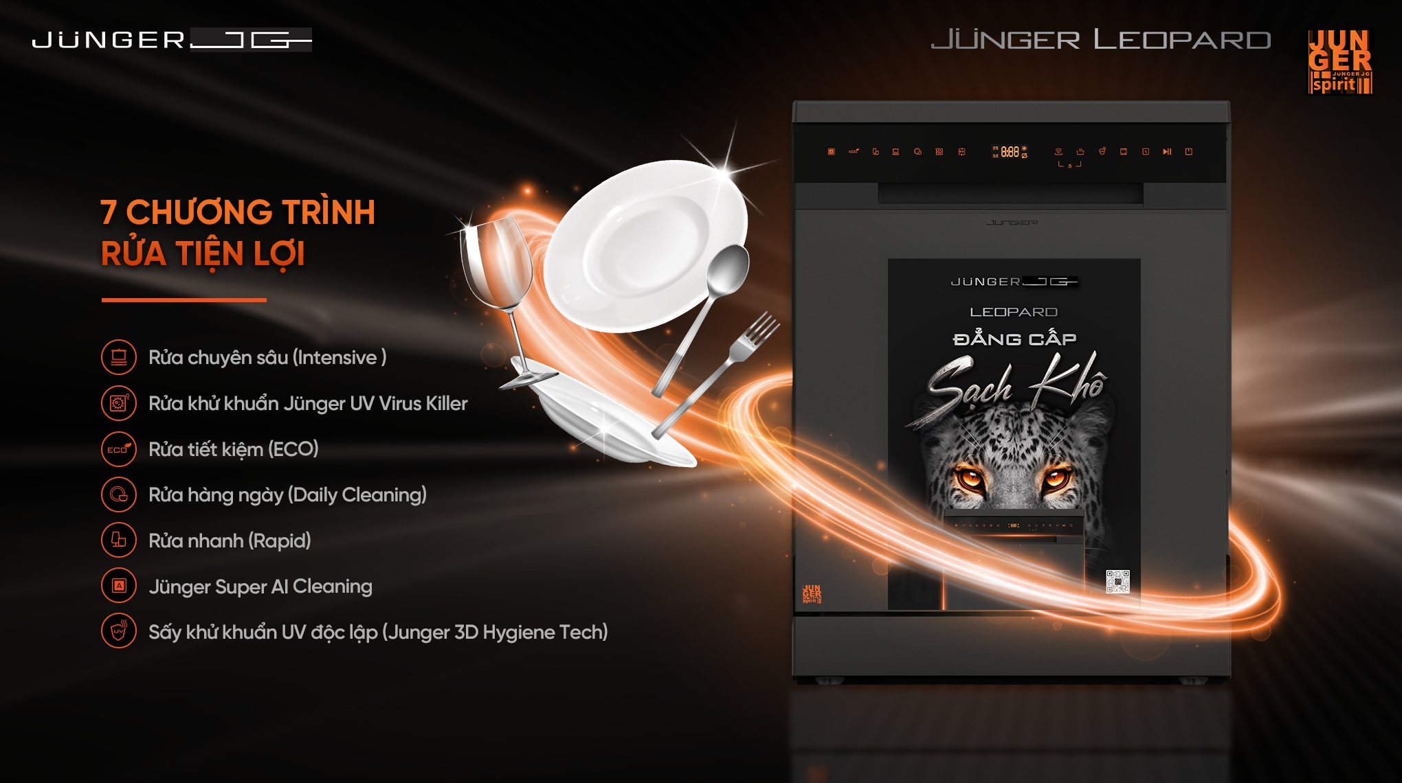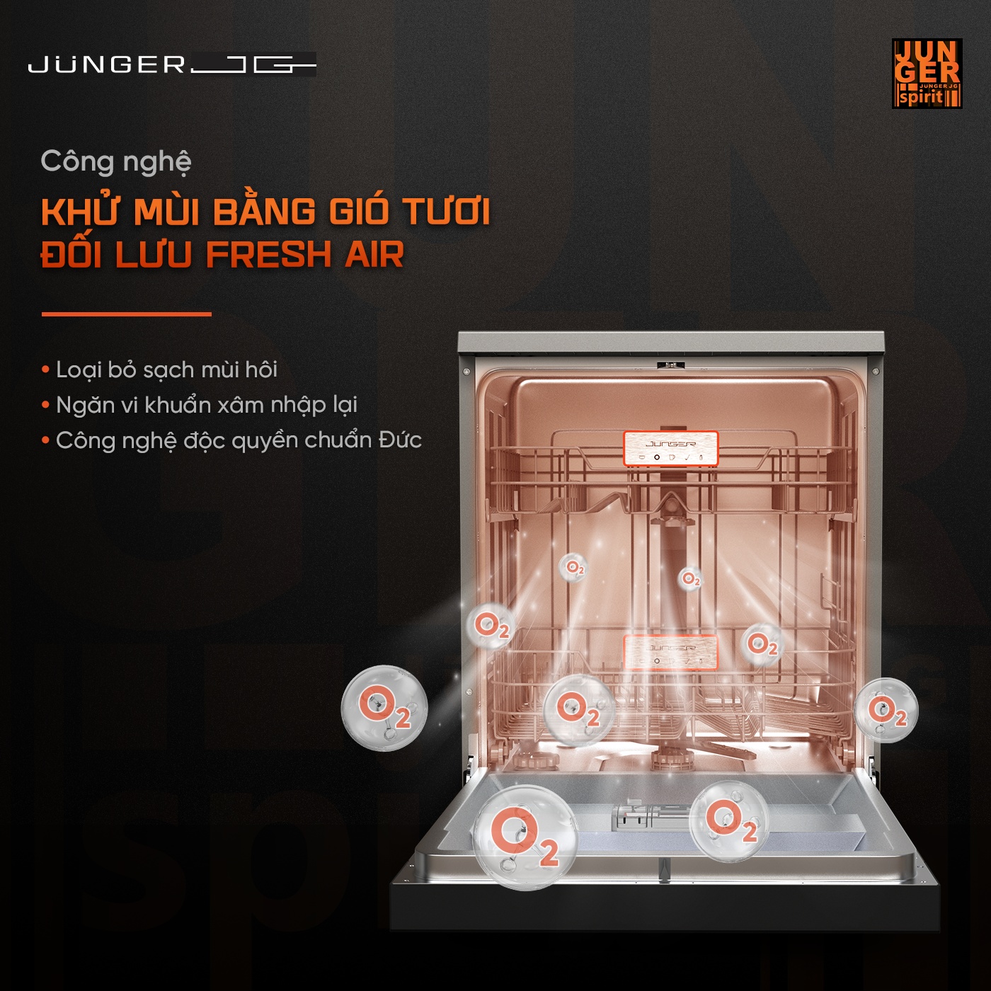 | Tiện ích | Khoá an toàn trẻ em Rửa từng phần Half Load Khử mùi bằng gió tươi đối lưu Fresh Air mặc định Tự động nhận biết chất trợ rửa Tự động căn chỉnh thời gian sấy phù hợp Junger JG Ag+ Protection khử khuẩn nước bằng ion Bạc Khử trùng/diệt khuẩn bằng công nghệ Junger JG UV Virus Killer Tech Chức năng rút ngắn thời gian rửa (Express) Tự động nhận diện độ bẩn của nước (Junger JG Super AI Cleaning) Chức năng hẹn giờ rửa Chức năng Junger JG Smart Lock khóa an toàn trẻ em Tự kích hoạt lại chương trình khi mất điện Chức năng tự làm mềm nước Tính năng báo hết muối và chất trợ rửa Tự ngắt khi không có nước đầu vào (AquaStop) Chức năng chống tràn nước/rò rỉ nước Chức năng bảo vệ quá tải - quá áp |