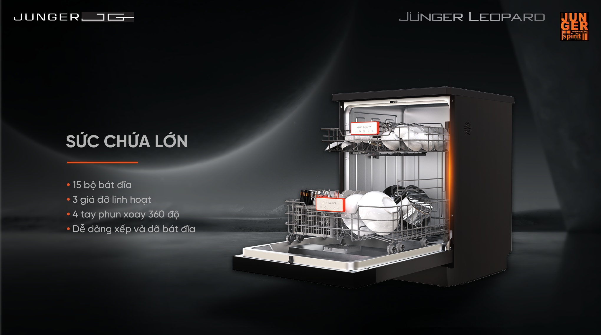 - Máy rửa bát Junger 15 bộ LEOPARD DWJ-183-VG trang bị 2 khay trên và khay dưới cùng 1 giỏ đựng dao thìa đũa giúp sắp xếp bát đĩa dễ dàng, tối ưu hiệu quả làm sạch.