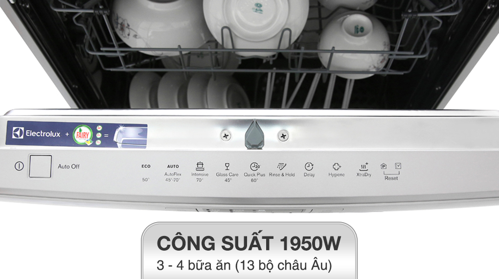 - Công suất 1950W nên máy rửa chén này có thể rửa được chén đĩa tương đương 3 - 4 bữa ăn (13 bộ châu Âu) của gia đình có 4 - 5 người Việt Nam.