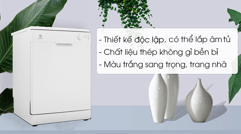 - Máy rửa bát Electrolux ESF5206LOW 1950W có thiết kế góc cạnh tinh tế, với màu trắng sang trọng, chắc chắn sẽ làm nổi bật không gian nhà bếp của bạn. Ngoài ra sản phẩm được thiết kế độc lập gọn gàng nên linh hoạt cho việc bố trí ở mọi không gian bếp nhà bạn như lắp vào hộc tủ dưới kệ bếp (không lắp âm vào tường), để trên mặt bếp tiện lợi.