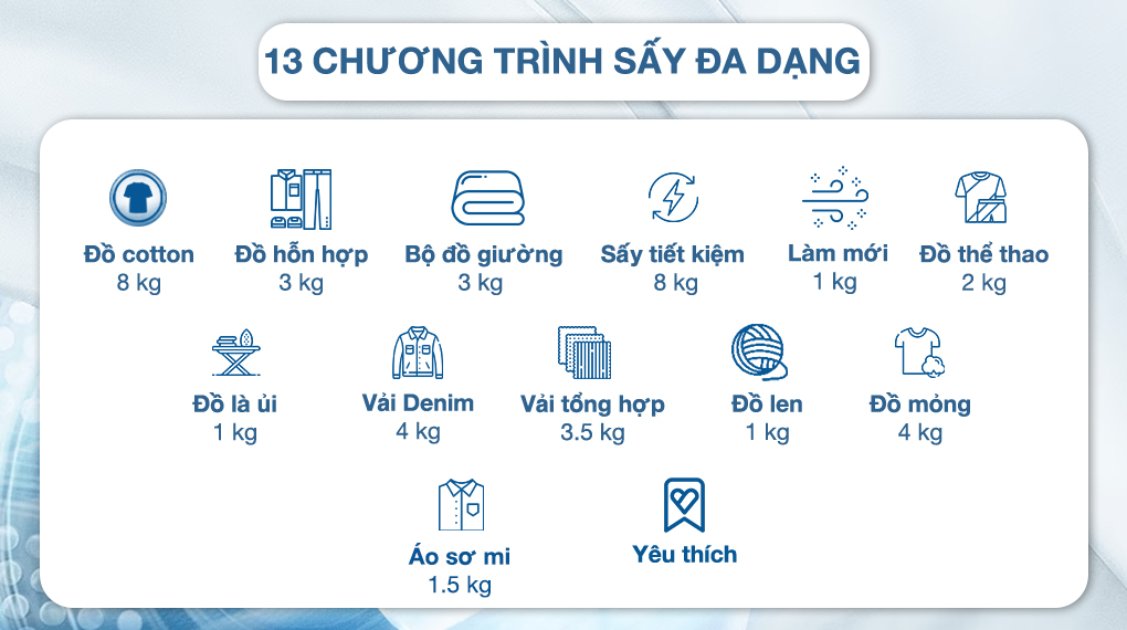 - 13 chương trình sấy cài đặt sẵn như Cottons (đồ Cottons), Mixed (đồ hỗn hợp), Delicates (đồ mỏng), Favorite (chương trình yêu thích), Energy Saver (tiết kiệm),... thỏa mãn nhu cầu sấy đồ đa dạng của mọi người dùng.