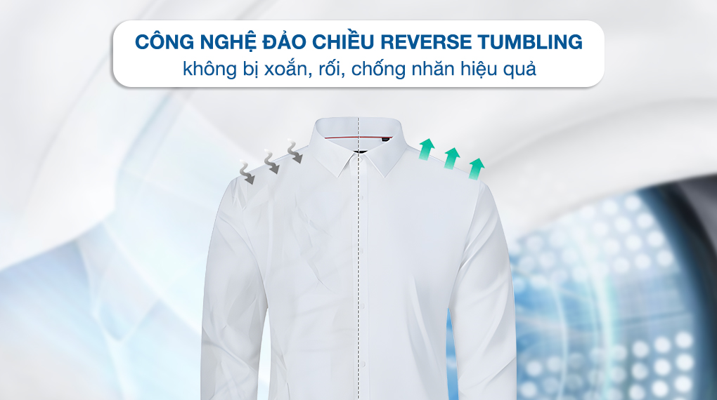 Công nghệ Reverse Tumbling: đảm bảo quần áo không bị xoắn, rối, chống nhăn hiệu quả, giúp bạn tiết kiệm thời gian ủi đồ nhờ cơ chế lồng sấy chuyển động luân phiên theo hai hướng liên tục.