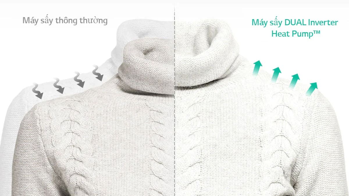 - Công nghệ sấy Heat Pump là một tính năng đặc biệt giúp giảm nếp nhăn và co rút trên quần áo. Thay vì sử dụng nhiệt độ cao như các máy sấy truyền thống, công nghệ sấy Heat Pump sử dụng nhiệt độ thấp hơn để làm khô quần áo.