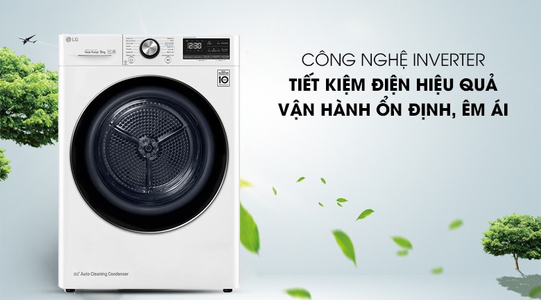 - Máy sấy bơm nhiệt LG DVHP09W sử dụng động cơ truyền động bằng dây curoa nhưng được tích hợp thêm công nghệ Inverter. Công nghệ Inverter góp phần giảm thiểu tối đa hiện tượng ma sát giữa các động cơ trong quá trình vận hành, nhờ đó mà giảm được độ rung lắc và sử dụng điện năng hiệu quả hơn, giúp tiết kiệm điện hiệu quả cho gia đình bạn.