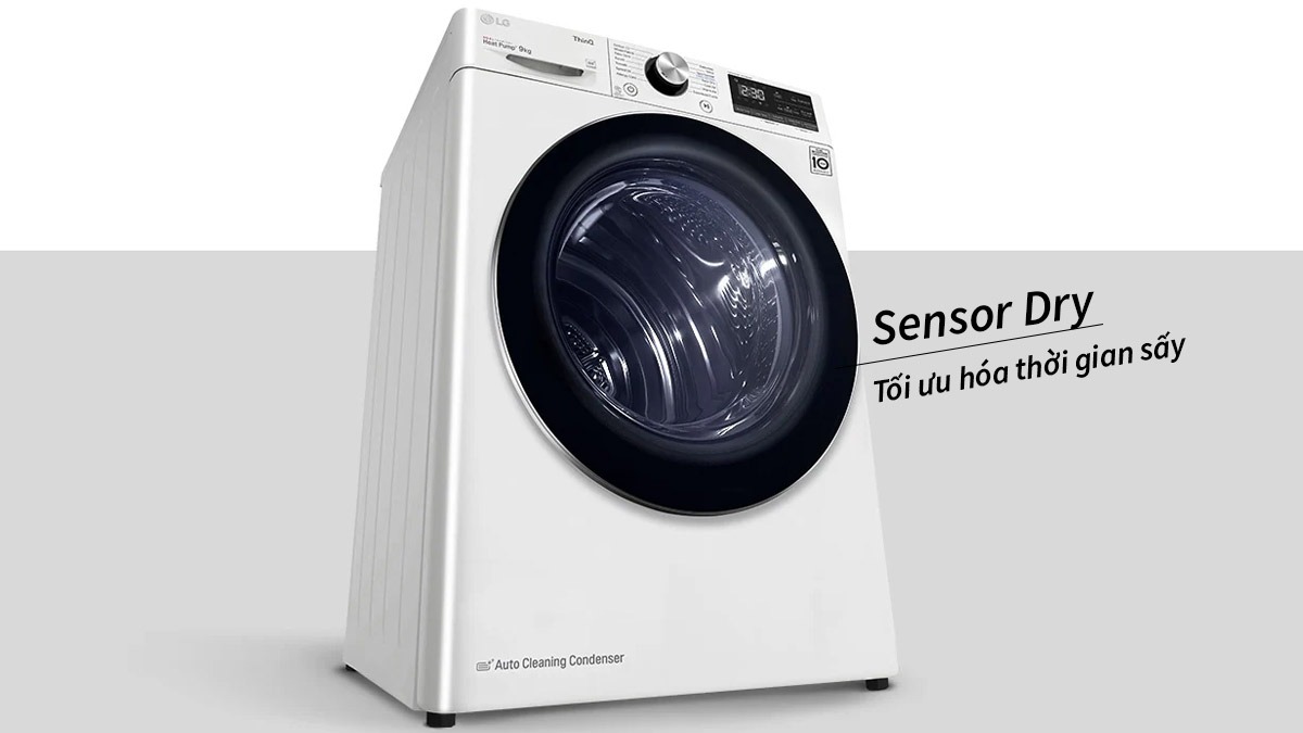 - Máy Sấy Bơm Nhiệt LG DVHP09W được trang bị công nghệ cảm biến độ ẩm Sensor Dry, giúp tối ưu hóa thời gian sấy. Cảm biến này tự động đo lường độ ẩm trong lồng sấy và điều chỉnh thời gian sấy phù hợp, đảm bảo quần áo được sấy khô một cách hiệu quả và không bị sấy quá mức.