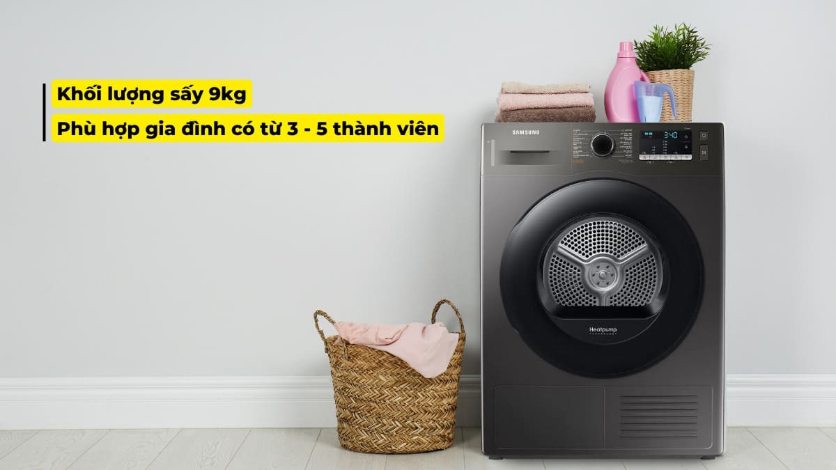- Với khối lượng sấy là 9kg, chiếc máy này khá phù hợp để đáp ứng nhu cầu giặt giũ của những gia đình có từ 3 - 5 thành viên. Khối lượng sấy lớn này cho phép người dùng làm khô nhiều quần áo cùng một lúc, giúp tiết kiệm thời gian và công sức trong quá trình giặt sấy.