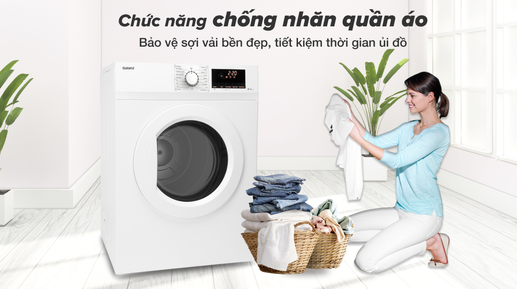 - Nhờ có chức năng chống nhăn quần áo được trang bị trên máy sấy Galanz, lồng giặt sẽ được đảo chiều nhiều lần để tách rời áo quần và hạn chế xoắn rối, giúp chúng được sấy khô nhanh chóng mà vẫn hạn chế các nếp nhăn trên sợi vải, đồng thời giúp bạn tiết kiệm đáng kể thời gian là ủi quần áo.