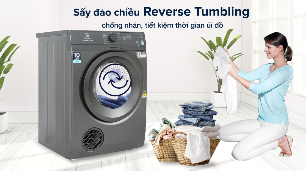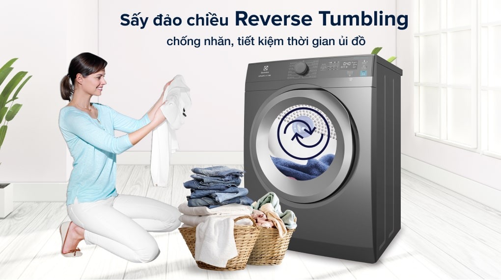 - Công nghệ sấy đảo chiều Reverse Tumbling: tình trạng quần áo xoắn rối và nhăn sẽ được giảm thiểu đáng kể (đến 32%) nhờ lồng sấy chuyển động và đảo chiều liên tục. Giờ đây, việc là ủi của bạn sẽ trở nên nhanh chóng và dễ dàng hơn.