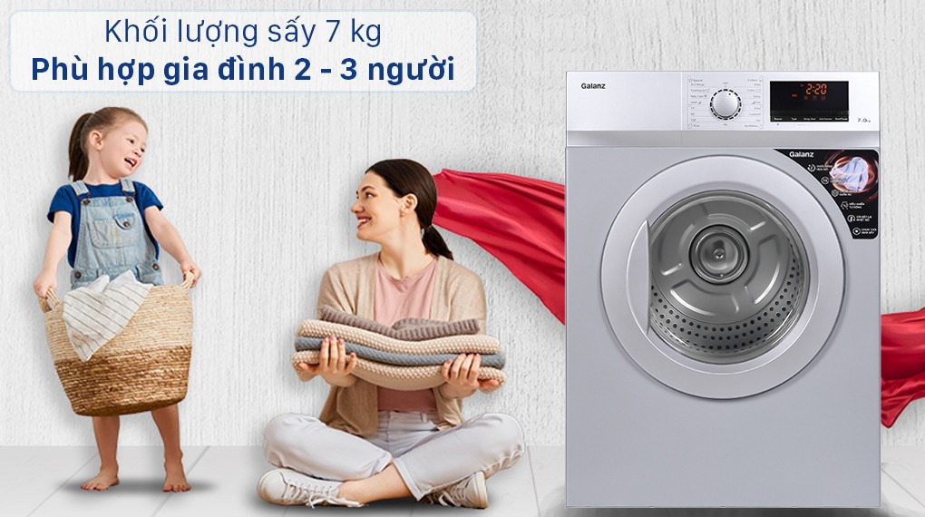 - Máy sấy thông hơi Galanz 7 Kg DV-70T5C(S) có khối lượng sấy là 7 kg, phù hợp cho những gia đình có 2 - 3 người. Tuy nhiên nếu gia đình đông người hơn nhưng nhu cầu sấy quần áo mỗi lần không nhiều thì đây vẫn là lựa chọn hợp lý hoặc các cơ sở dịch vụ kinh doanh tiệm giặt ủi, nhà nghỉ,...