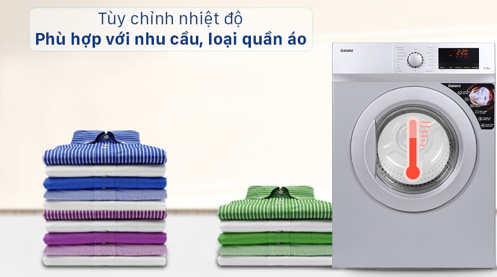 - Ngoài các chương trình sấy tự động được thiết lập sẵn thông số thích hợp thì bạn vẫn có thể cài đặt lại nhiệt độ sấy phù hợp với từng loại quần áo, khối lượng đồ khác nhau theo nhu cầu của mình, giúp tối ưu điện năng sử dụng tốt hơn cũng như bảo vệ quần áo.