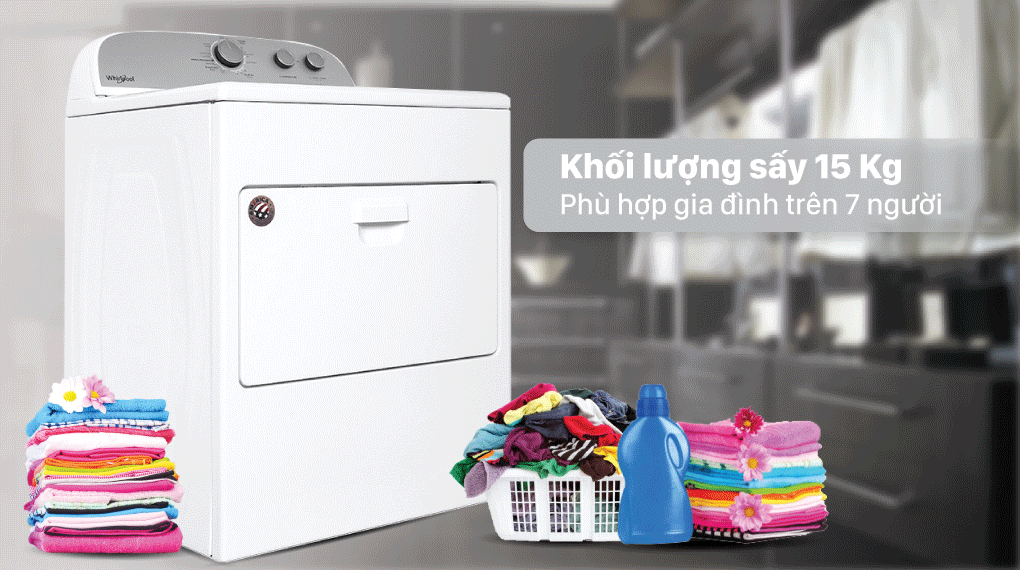 - Máy sấy Whirlpool 3LWED4815FW đáp ứng nhu cầu sấy quần áo đến 15 kg, phù hợp cho những gia đình hơn 7 người và các cửa hàng giặt ủi, nhà nghỉ, khách sạn... để xử lý nhiều quần áo mà không phải tốn nhiều điện năng và thời gian để chia thành nhiều mẻ sấy.