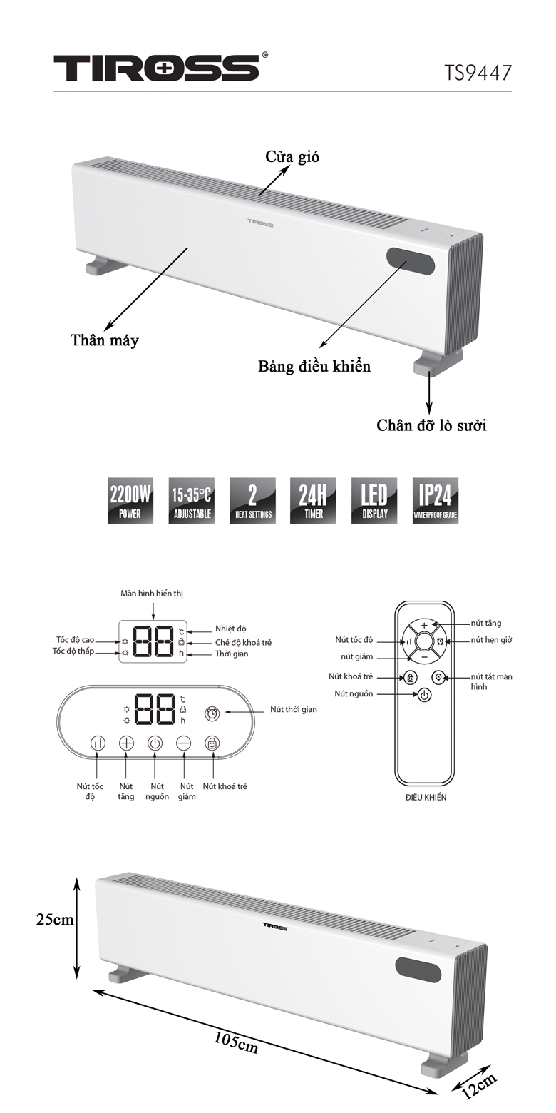 Có bình chứa nước kèm chức năng tạo ẩm Chức năng hẹn giờ 24 giờ 2 chế độ cài nhiệt Chân đỡ lớn chắc chắc |