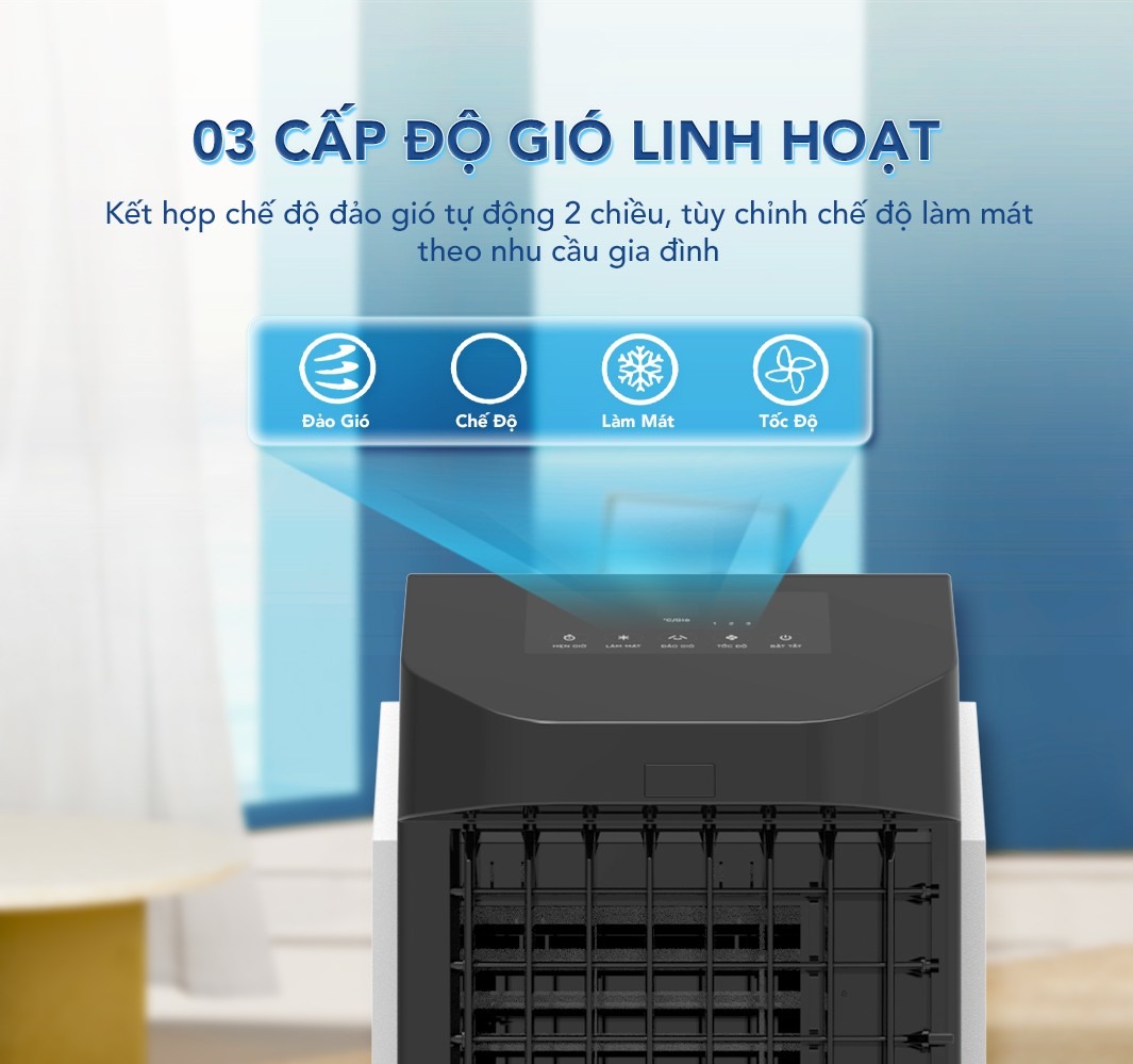 | Tiện ích | Điều khiển từ xa Tự ngắt bơm khi cạn nước Hẹn giờ tắt Có thang đo hiển thị mực nước Có van xả cặn khoang chứa nước Đảo gió tự động 2 chiều trái - phải Có bánh xe di chuyển |