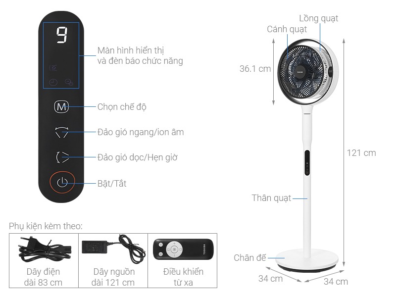 - Quạt đứng Toshiba F-DSC80XVN(W) với thiết kế trang nhã, công suất quạt 25W mô phỏng luồng gió tự nhiên và gió thường làm tăng sự thoải mái nhờ trang bị 7 cánh trước và 9 cánh quạt sau với đường kính 25 cm. Kết hợp cùng bộ phát ion âm làm thanh lọc không khí, đem đến hiệu quả mát - sạch cho ngôi nhà bạn.