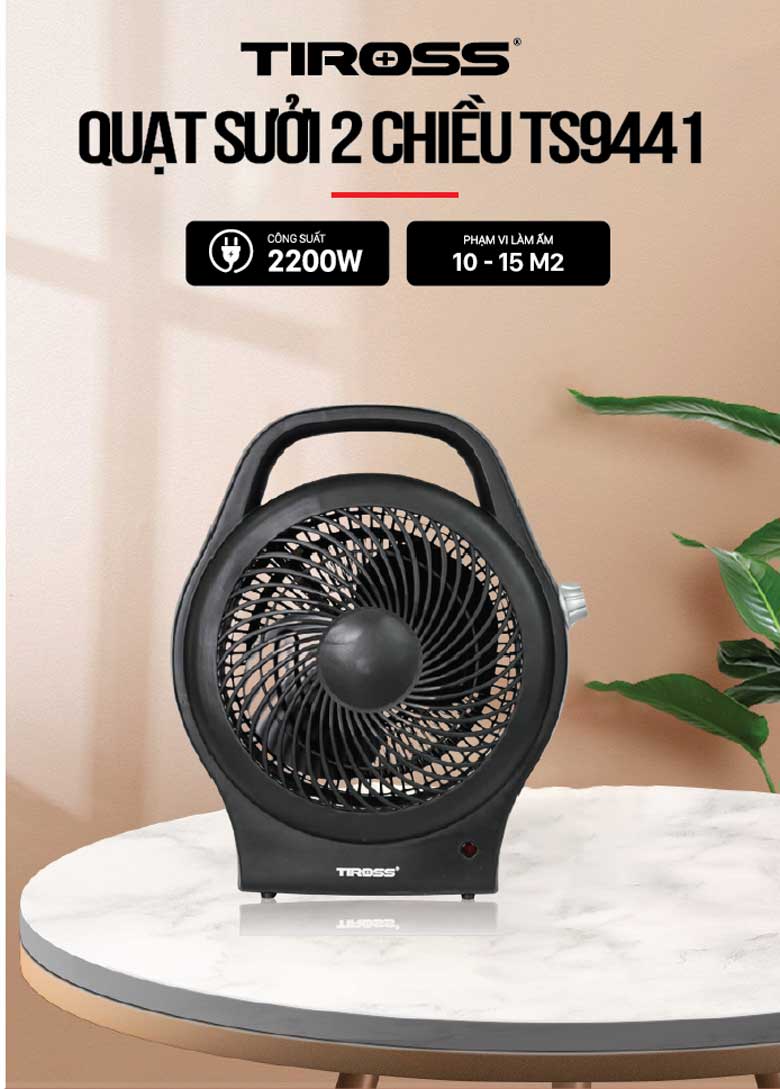 Quạt sưởi Tiross có công suất tối đa lên tới 2200W, sưởi ấm/làm mát không khí nhanh chóng, thích hợp cho các không gian có diện tức 10 - 15 m2.