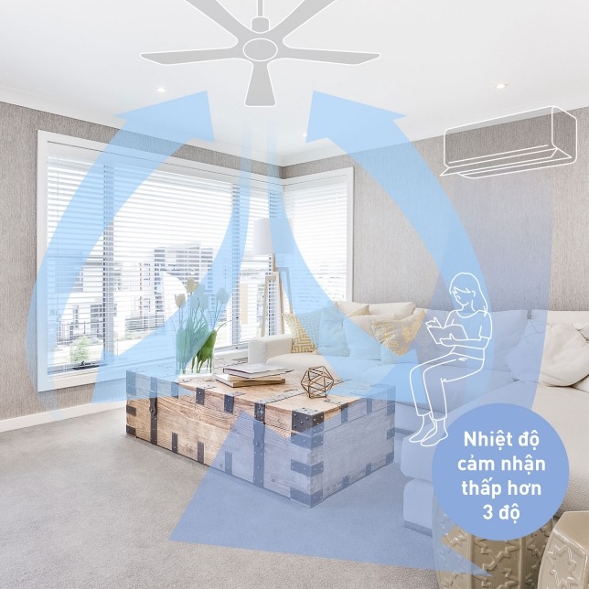 - Quạt trần không chỉ lưu thông không khí và cân bằng nhiệt trong phòng, mà còn lan tỏa làn gió nhẹ từ trần, hiệu quả trong việc giảm mức nhiệt độ cảm nhận. Nhiệt độ cảm nhận có thể chênh lệch xấp xỉ 3°C khi có gió nhẹ so với khi không có gió nhẹ.