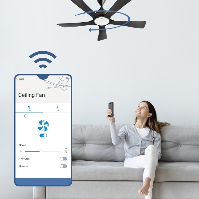 - Quạt trần được bật bằng ứng dụng* kết nối với mạng WiFi của bạn, cho phép điều khiển quạt trần kết nối WiFi bằng các thiết bị di động. Cần có hệ điều hành Android 6 trở lên hoặc iOS 12 trở lên để sử dụng ứng dụng. 1 tài khoản người dùng chỉ có thể điều khiển tối đa 8 quạt trần kết nối WiFi.