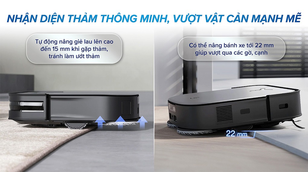 | Tiện ích | Cảm biến chống rơi, chống va chạm Điều khiển qua kết nối trên điện thoại thông minh Tự động đổ bụi, giặt, sấy khô vải lau Lưu được 3 bản đồ Tự quay về đế/trạm sạc Tự làm sạch hộp bụi, đổ bụi từ hộp chứa lên trạm sạc Tính năng tường ảo Trợ lý giọng nói Yiko Vừa hút vừa lau nhà Ghi nhớ khu vực chưa vệ sinh Điều khiển bằng remote Hẹn giờ |