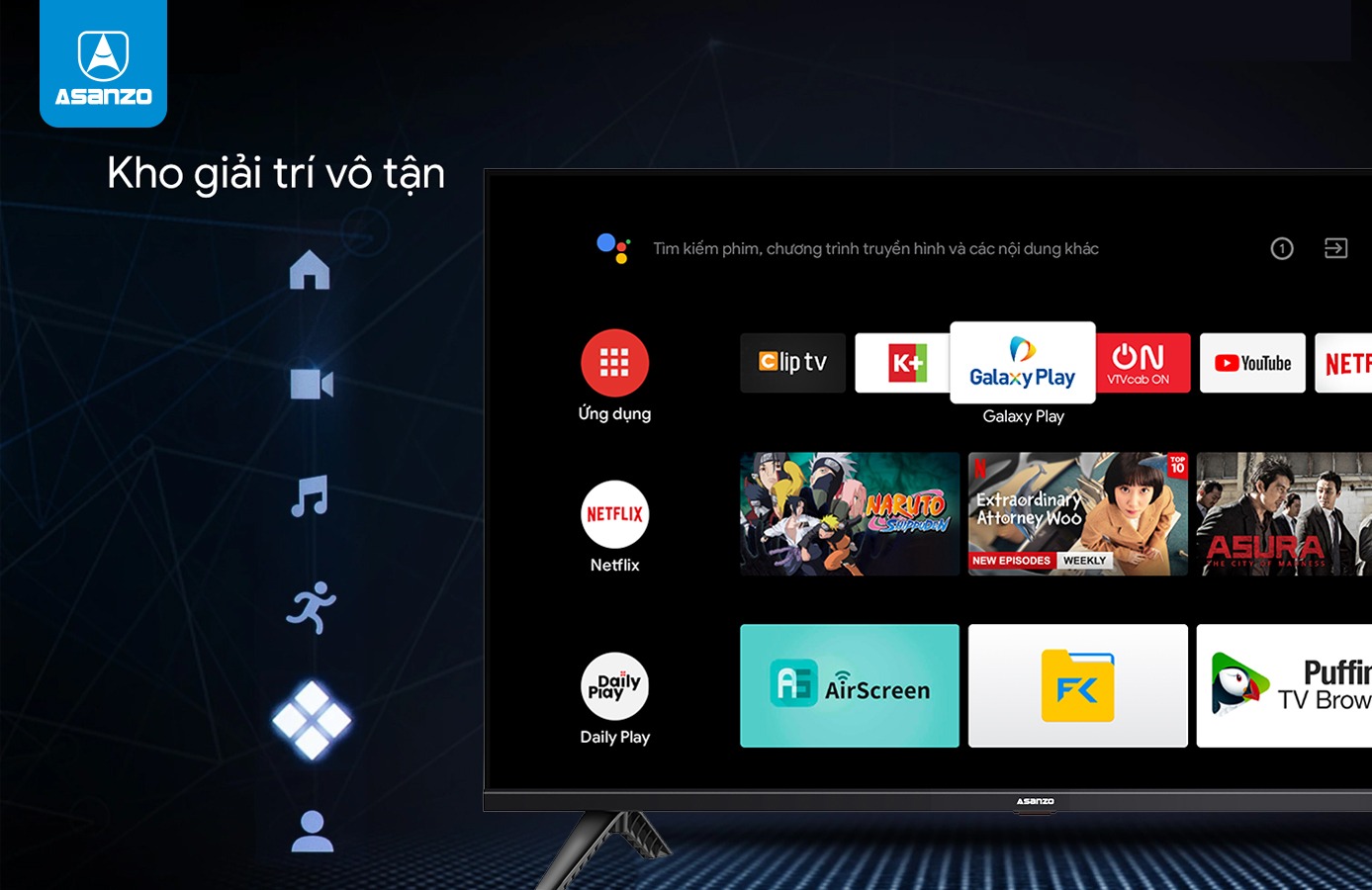 - Kho ứng dụng đa dạng từ Google Play Store. Bạn có thể tải hàng nghìn ứng dụng Android về chiếc tivi của mình từ kho ứng dụng.Tivi Smart Asanzo 43 Inch Islim có kho ứng dụng phong phú đáp ứng đa dạng nhu cầu giải trí của người dùng.