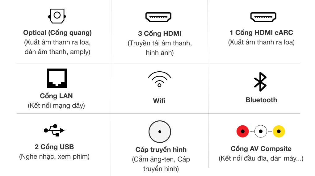 | Cổng nhận hình ảnh, âm thanh: | 4 cổng HDMI có 1 cổng HDMI eARC (ARC), 1 cổng Composite |