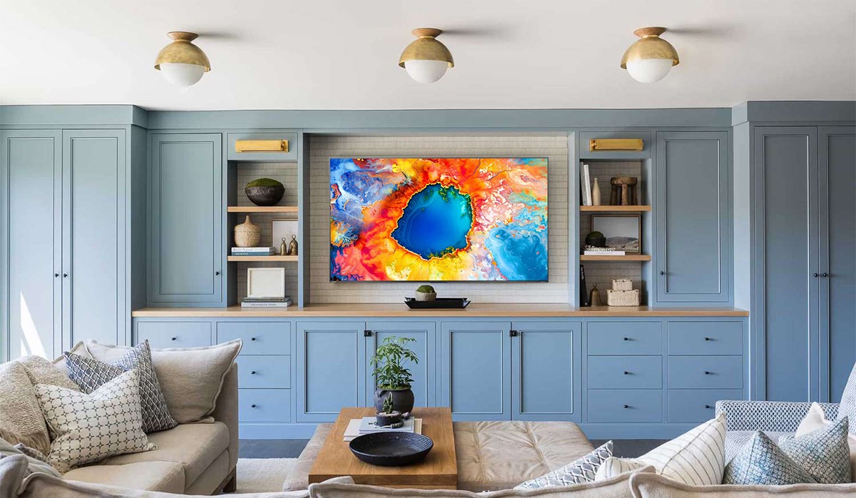 - Bên cạnh đó, tivi cũng mang đến cho không gian bày trí vẻ đẹp thanh lịch với cạnh viền nhựa vát phẳng tinh tế kết hợp cùng chân đế chữ V ngược thuôn mảnh. Dù bạn bày trí tivi bằng cách treo tường hay đặt kệ thì không gian nội thất cũng sẽ được điểm tô một cách đẹp mắt.