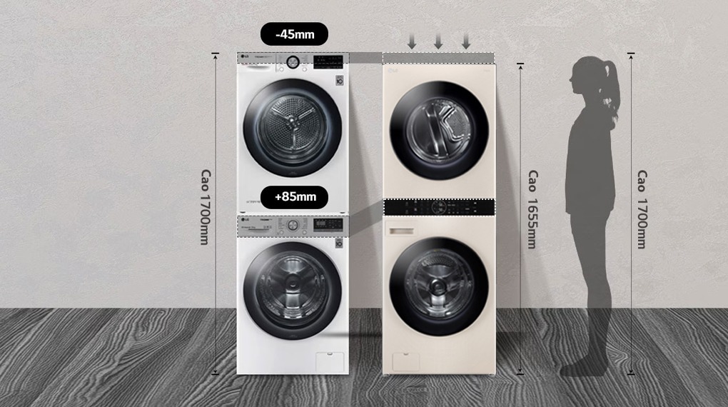 - Bảng điều khiển cảm ứng chỉ dẫn tiếng Việt kết hợp màn hình hiển thị sắc nét, thiết kế trực quan và nằm ngay ở vị trí trung tâm, bố trí cao hơn bảng điều khiển của 2 máy giặt và máy sấy đặt chồng lên nhau đến 85 mm. Nhờ đó người dùng dễ dàng tiếp cận và tùy chỉnh chương trình giặt, sấy linh hoạt.