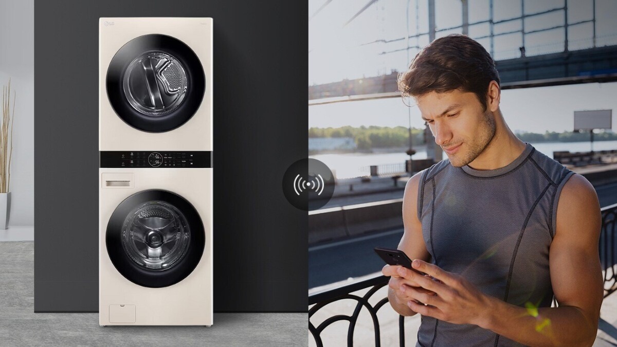- Điều khiển từ xa bằng điện thoại qua ứng dụng LG ThinQ: dễ dàng phối ghép máy giặt với thiết bị di động qua LG ThinQ, lựa chọn chương trình giặt, sấy tùy thích từ xa mọi lúc mọi nơi.
