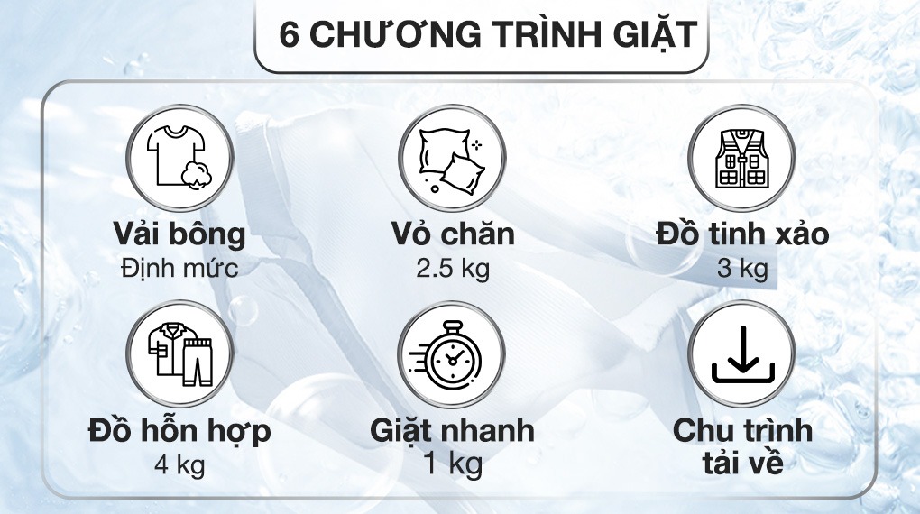 - Trang bị 6 chương trình giặt cài đặt sẵn bao gồm: vải bông, vỏ chăn, đồ tinh xảo, đồ hỗn hợp, sấy nhanh, chu trình tải về. Trong đó, có chương trình sấy nhanh giúp tiết kiệm thời gian giặt, đảm bảo khi bạn cần bộ đồ yêu thích đã sẵn sàng để bạn mặc lên người đi chơi, đi dự tiệc, du lịch,...