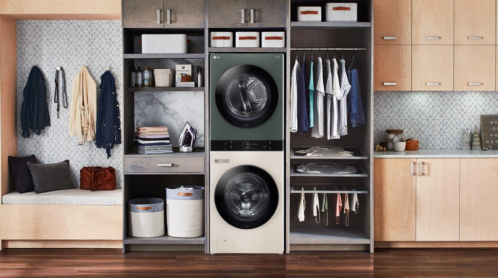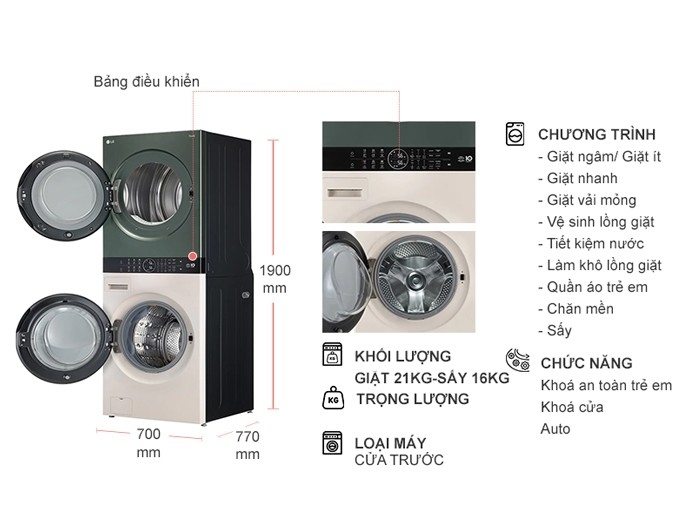- Tháp máy giặt sấy hiện đại và tiện dụng có thiết kế đẹp mắt, tích hợp máy giặt và sấy xếp chồng lên nhau cùng nhau tạo nên tác phẩm giặt hiện đại, với gam màu trang nhã, thanh lịch.