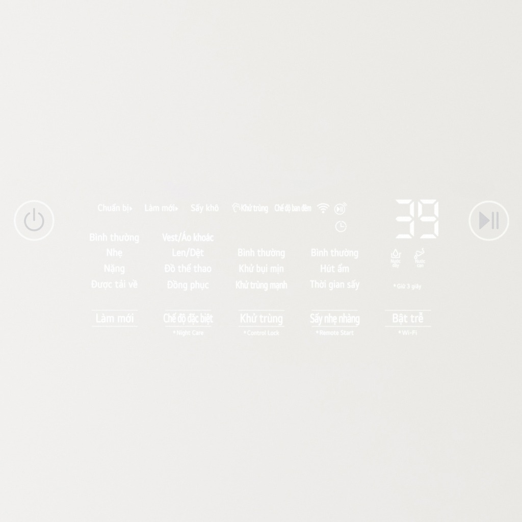 Tiện ích | Tạo và giữ nếp ly quần tây Ngăn ngừa co rút, hư hỏng sợi vải Làm mới, loại bỏ nếp nhăn và mùi khó chịu của quần áo Khóa trẻ em Hẹn giờ giặt Chế độ làm khô nhẹ nhàng bảo vệ quần áo Gentle Dry Chế độ hút ẩm xung quanh Hệ thống lọc xơ vải tự động Cho phép điều khiển máy giặt từ xa qua ứng dụng SmartThinQ |