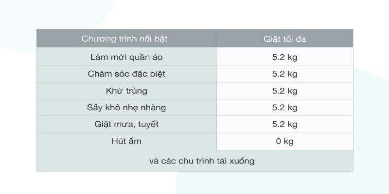 Ngoài ra với khối lượng giặt 5.2 kg tương đương khoảng 4 quần áo, sản phẩm sẽ đáp ứng tốt nhu cầu sử dụng cho những gia đình nhỏ từ 2 - 3 người hoặc những cá nhân bận rộn, không có nhiều thời gian để giặt giũ nhưng lại mong muốn những bộ đồ phẳng phiu, thơm tho nhanh chóng.