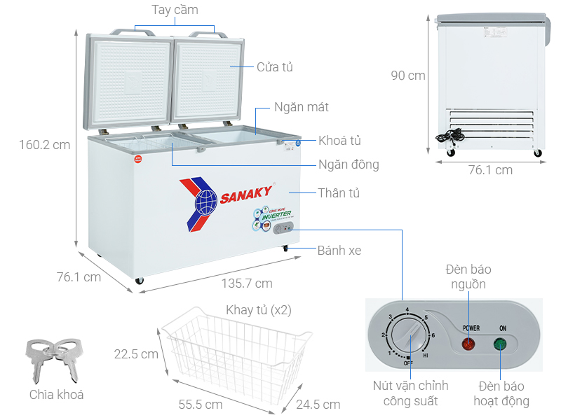 Nút điều chỉnh nhiệt độ bên ngoài tủ Inverter tiết kiệm điện Khoá cửa tủ Giỏ đựng đồ Lỗ thoát nước Bánh xe |
