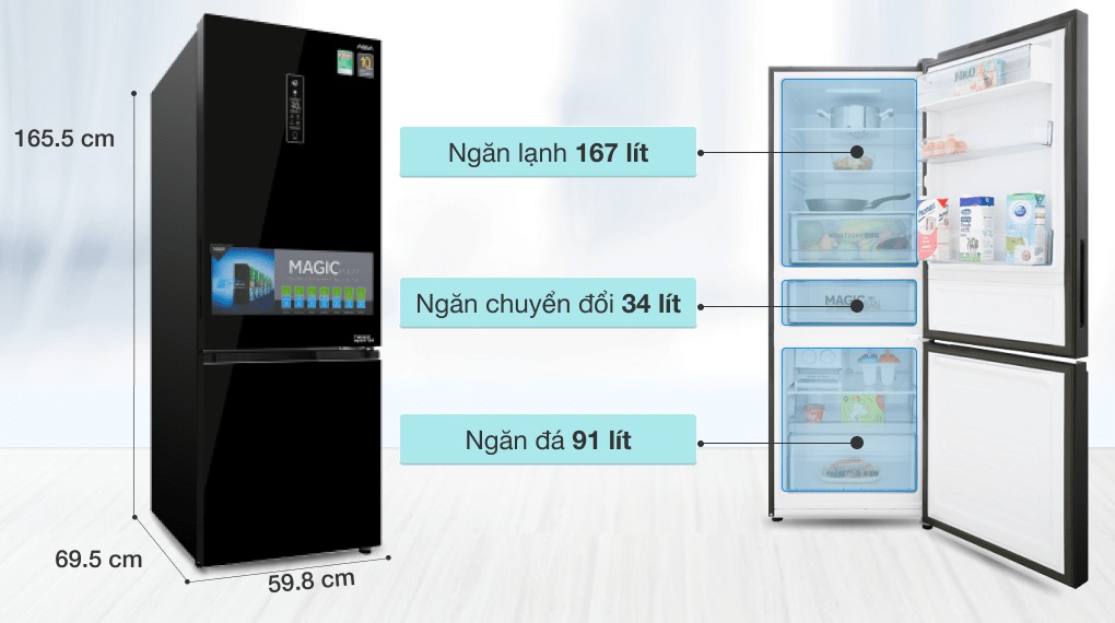 | Dung tích sử dụng | 317 lít(Ngăn đá 91 lít, Ngăn lạnh 167 lít, Chuyển đổi 34 lít) |
