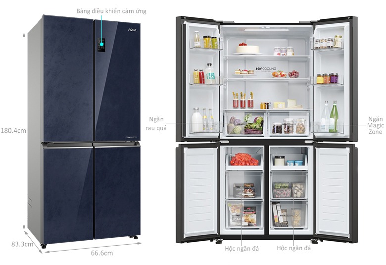 - Với dung tích thực lên đến 469L, tủ lạnh nhiều cửa Aqua là lựa chọn lý tưởng cho các gia đình có từ 4 đến 5 thành viên. Không gian rộng rãi bên trong tủ giúp bạn sắp xếp và bảo quản thực phẩm một cách dễ dàng và tiện lợi.