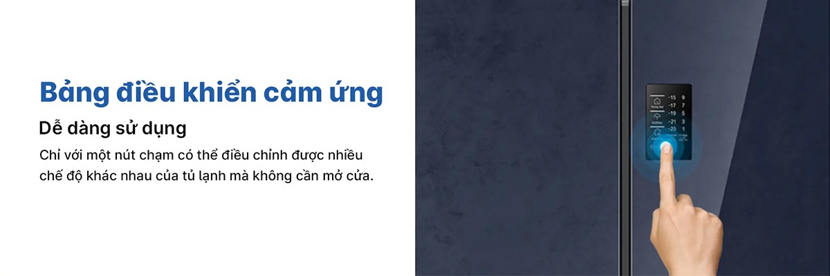 - Dễ dàng điều khiển tủ lạnh bằng bảng điều khiển cảm ứng ngay từ ngoài cửa tủ. Chỉ với một chạm trên đầu ngón tay, bạn không cần mở cửa tủ ra mà vẫn chọn được chế độ hoạt động mong muốn.