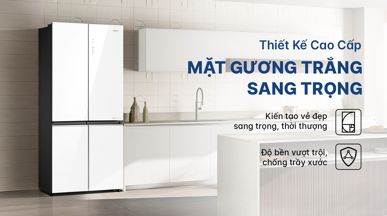 - Tủ lạnh Aqua Inverter 529 lít Multi Door AQR-M600XA(GC) là dạng tủ lạnh 4 cánh ngăn đá dưới với tổng dung tích 529 lít, có kiểu dáng cao và sâu sẽ hài hòa với tổng thể không gian bếp. Mặt trước cửa tủ được thiết kế là dạng mặt gương mờ sang trọng, dễ vệ sinh và còn tăng thêm vẻ đẹp cho căn bếp.