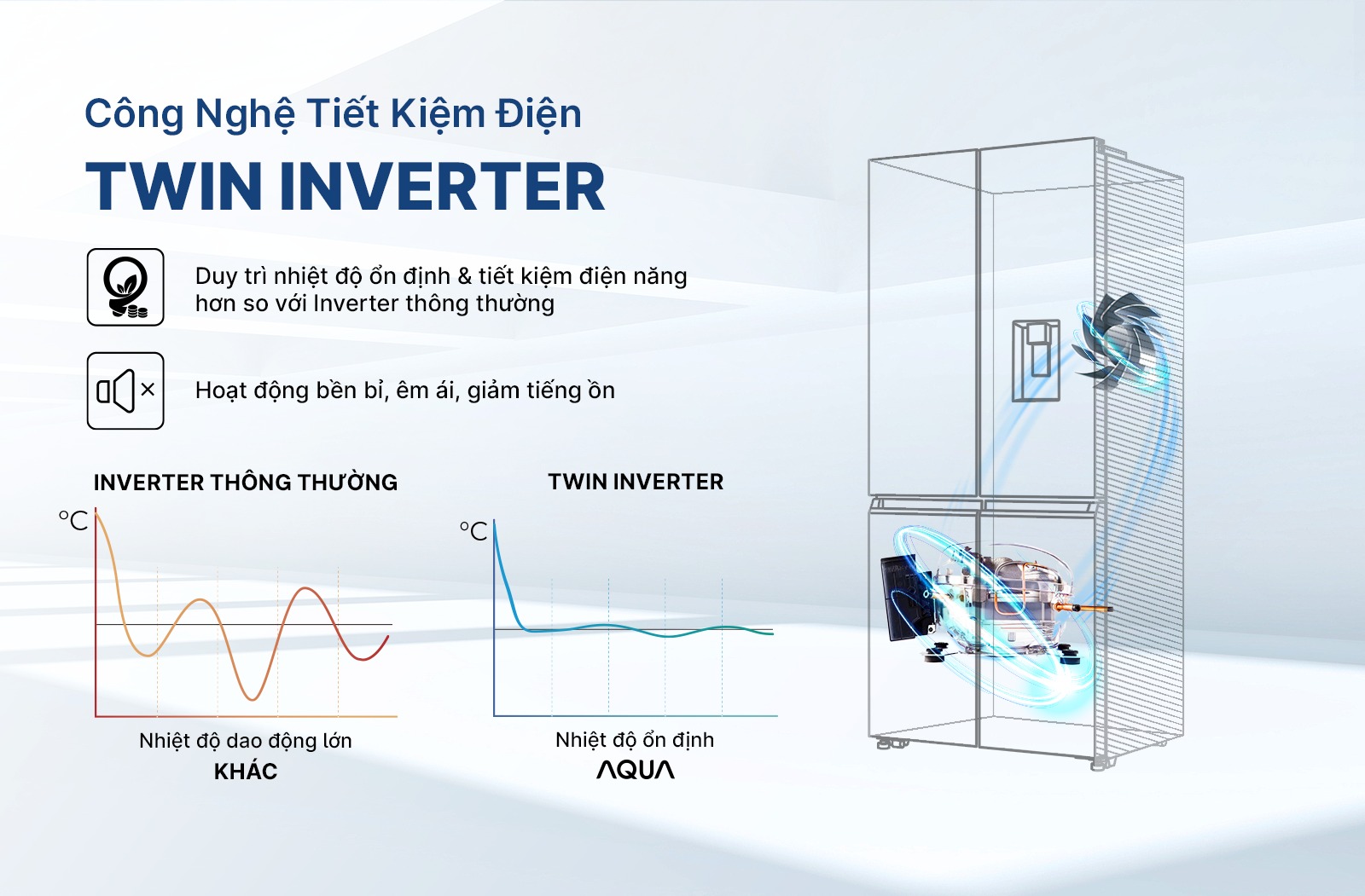 - Tủ lạnh AQUA Inverter AQR-M600XA(GC) với công nghệ Twin Inverter giúp vận hành bền bỉ, êm ái.