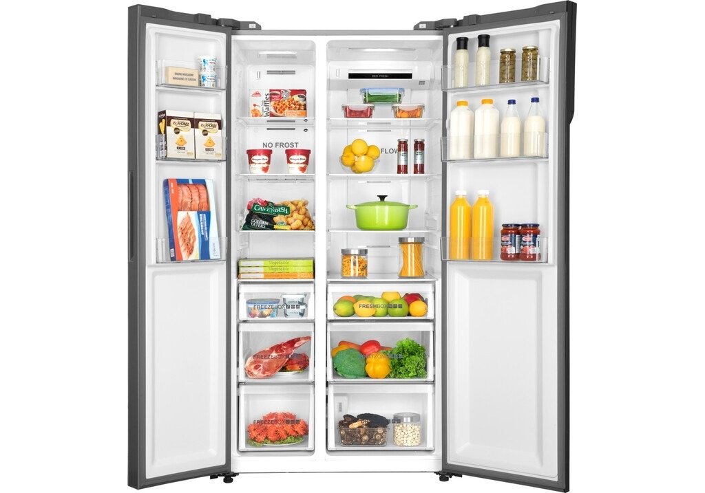 - Tủ lạnh có 2 cánh cửa 2 bên, 1 ngăn đá dưới và 1 ngăn lạnh trên và thiết kế có các vách ngăn kệ để dễ dàng sắp xếp thực phẩm theo nhu cầu của gia đình bạn.