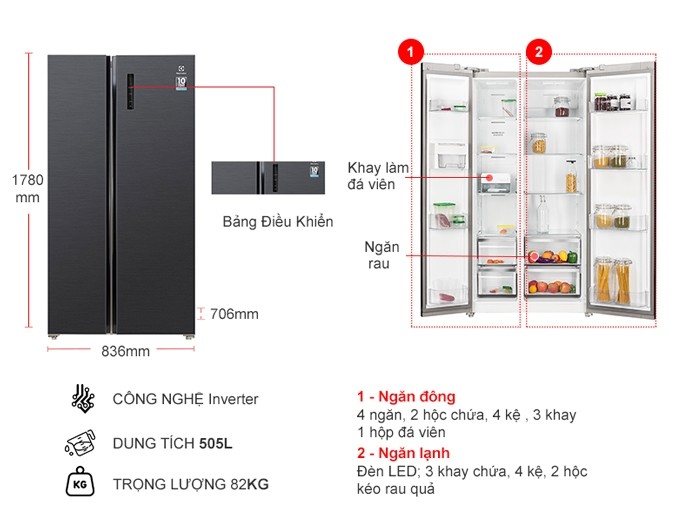 - Tủ lạnh Electrolux EME3700H-H được thiết kế 3 cửa hiện đại, tiện nghi. Tủ lạnh sắc đen sang trọng là điểm nhấn nổi bật cho không gian bếp gia đình bạn.Tủ Lạnh Electrolux Inverter ESE5401A-BVN không chỉ sở hữu kiểu dáng Side by Side hiện đại mà còn có dung tích lớn, cho phép bạn lưu trữ và bảo quản nhiều thực phẩm hơn so với các mẫu tủ lạnh đời cũ có dung tích nhỏ. Nếu gia đình bạn có thói quen mua nhiều thực phẩm để dự trữ, thì chiếc tủ lạnh Electrolux Side by Side này là lựa chọn hoàn hảo cho gia đình từ 4 - 5 người.